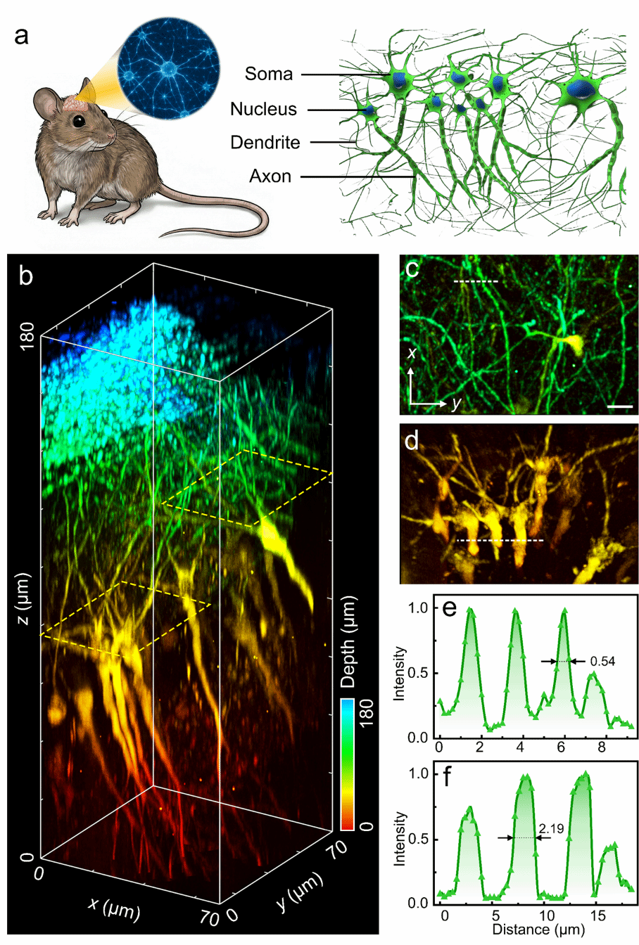 上图展示了利用SS-SIM对表达Thy1-EGFP荧光蛋白的小鼠脑组织的三维成像结果。图3(b)清晰展现了小鼠脑组织中神经元胞体、轴突和树突等复杂神经网络结构。图3(c)和(d)放大展示了图3(b)中黄色虚线指示的位置对应的xy 横截面。通过对图3 (e)和图3 (f)中强度曲线拟合表明该处树突和细胞体的半高全宽分别为 0.54 ± 0.02 μm 和 2.19 ± 0.11 μm 。以上应用表明SS-SIM在脑科学等深层组织大深度,超分辨三维成像领域具有巨大潜力。
