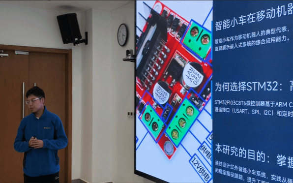 答辩现场,各参赛队伍轮番登台,带来了一场硬核的科创成果展示。从“神经-帕累托绩效评价系统(NPMS)”的理论创新,到“基于STM32的智能浇花系统”“超声波避障小车”的生动实践,再到“基于STM32的矿井环境监测六足机器人”“矢量智测——面向电路实验与工业检测的矢量伏安法器件测量装置”的技术突破,一批兼具专业深度与应用价值的作品精彩亮相。选手们借助PPT、演示视频及现场实物演示,生动还原了研发历程中的攻坚瞬间。面对评委的连环质询,他们沉着冷静,条理清晰地阐释项目的设计初衷、技术壁垒与落地前景,展现出扎实的专业素养与敏捷的思辨能力。