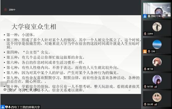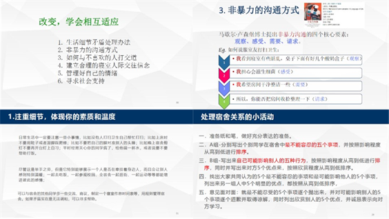 没有人愿意被孤立、被排挤。当前时期,学校认真落实防疫要求,丁老师对宿舍制动期间可能会面临的人际关系紧张有效地进行了辅导。她将方法和事例结合起来现场教学,逐一介绍了同学们关于洗澡唱歌、打扫卫生、作息时间不一致等常见情形的妥善处理方式。
