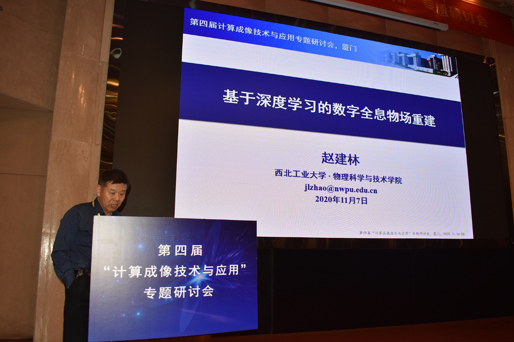 赵建林教授,以“基于深度学习的数字全息物场重建”为题介绍一种基于U-net的数字全息物场重建方法,其通过构建深度神经网络建立数字全息图和重建物场复振幅之间的非线性映射关系,实现数字全息物场的神经网络重建。