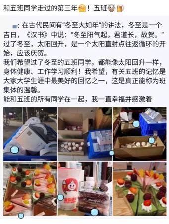 (通讯员:高原 程睿)冬至是我国农历中一个重要的节气,也是中华民族的传统节日,在古代民间有“冬至大如年”的讲法。然而2021年冬至正值期末备考复习关键时期,且西安市疫情形势陡增严峻。在这种环境下,同学们难免会有压力、有紧张焦虑的情绪。为了给忙碌中的同学们加加油、鼓鼓劲,缓解同学们的压力、增强班级凝聚力,物理与光电工程学院积极动员员工党员、入党积极分子、员工干部以多种方式自发给同学们送去温暖和关爱。