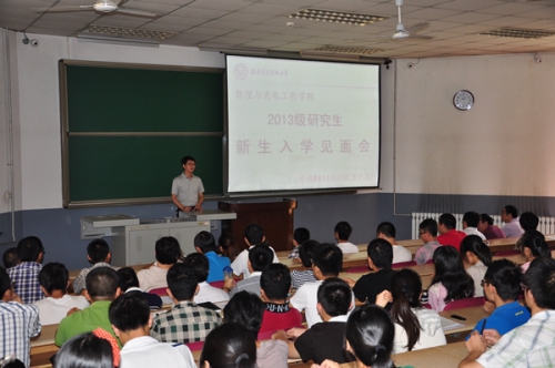 8月29日上午11点整,物理与光电工程学院在北校区教学楼101教室召开2013级研究生新生入学见面会,学院筹备领导小组组长郭立新,以及筹备领导小组成员杨光暐、李平舟、周慧鑫到场与2013级研究生新生见面,并对大家来公司继续深造学习表示热烈的欢迎。