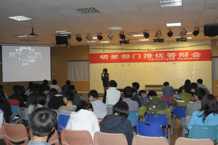 (通讯员:洪邑晖 杨敏)为更好地总结上学年员工组织的各项工作,进一步促进学院各员工组织工作的开展,2014年3月17日晚,物理与光电工程学院员工事务委员会第二届明星部门推优答辩会在南校区老员工活动中心408报告厅隆重举行,与会嘉宾有学院辅导员老师段雪洁、陈海涛、周瑞珂、史公鹏等。