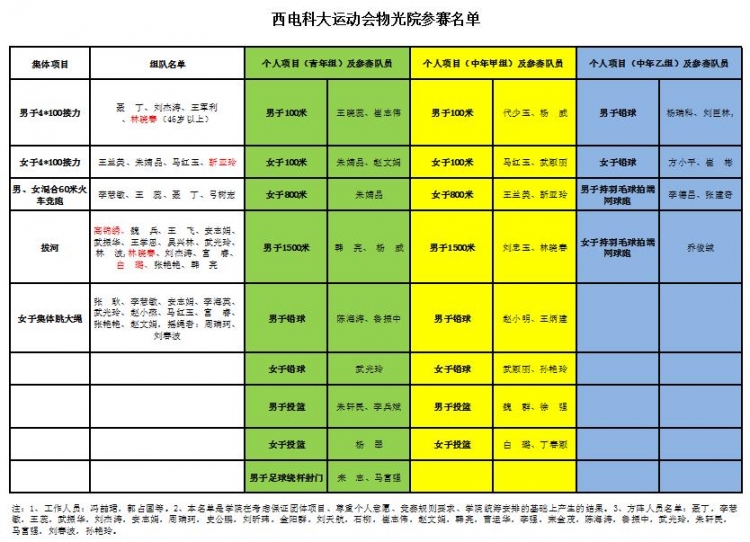 集团工会于4月28日下发了《yl23455永利集团2015年教职工运动会竞赛规程》,物理与光电工程学院积极响应,并于当日下午召开学院各系室工会组长会议进行了全面动员,同时传达了教职工运动会的竞赛安排、项目分组、竞赛办法等,并对各系室的组织报名、选拔、训练等具体工作做了详细部署。学院各系室报名积极踊跃,各参赛项目的报名人数均超限报名额,经过近一周的队员协商选拔,学院在尊重个人意愿、保证团体项目、争创优良成绩的基础上,最终形成了《西电科大运动会物光院参赛名单》,具体情况如下。