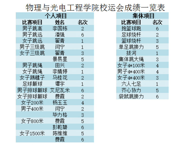 作为一只年轻的队伍,物理与光电工程学院代表队第二次踏上了校运会的征程。赛前,在院领导的统筹下,各项活动的训练有条不紊地展开。全体辅导员老师与众多同学一道,积极主动奉献出自己宝贵的休息时间,投入到跳大绳、拔河、六人七足以及开幕式舞蹈等活动的训练当中。相关组织和部门也在积极筹备运动会所需的物资,如帐篷、桌椅、食物和饮品等,同时还为参加比赛的运动员特意购置了葡萄糖和钉鞋。精心的筹备终于在赛场上得到了回报,运动会期间,公司代表队的入场舞博得了观众的一致好评,团体趣味项目表现依然抢眼,众多个人项目同样捷报频传。在传统优势项目六人七足中,公司以压倒性优势蝉联冠军;在强手如林的拔河赛场上,更是以全胜战绩傲视群雄;男子三级跳、足球颠球以及女子跳远、跳绳等单人项目我们同样当仁不让,勇折桂冠。这些都是公司代表队科学训练,辛苦付出的最好证明。然而比所取得的成绩更重要的是,本次运动会极大地凝聚了全院上下的人心,鼓舞了士气,同时也充分激发出了大家的集体荣誉感,让大家感受到了体育运动真正的魅力所在。