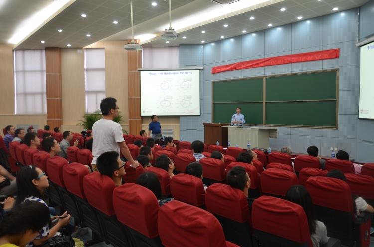 在第一个报告中,沈忠祥教授首先介绍了3D频率选择结构(FSS)的发展历史与应用,接着针对传统的2D频率选择结构所面临的有限的带宽、频率响应不稳定等问题,提出了最新的3D频率选择结构算法并介绍了其优点,同时指出了3D频率选择结构目前存在的技术难题和将来可能的发展方向。最后,他介绍了目前常用的各种天线的优缺点及其可能的应用前景,并向大家分享了他们团队在这一领域的研究成果。接下来的一个报告,沈教授与在座的师生分享了他近期设计的几个低配置轴向辐射天线的经验,介绍了轴向辐射天线的装配环境与优势所在,最后向大家介绍了三种在未来具有研究价值的天线类型。