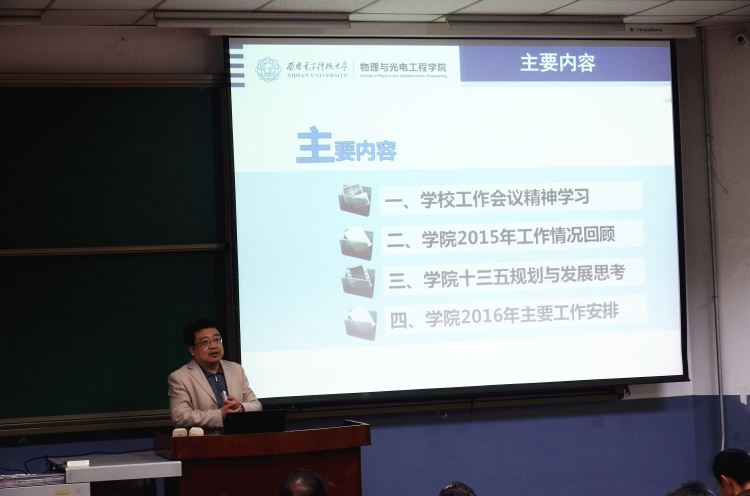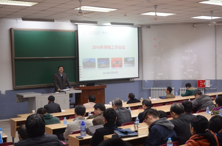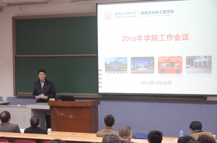 3月24日晚,物理与光电工程学院于北校区阶梯教学楼110召开2016年工作会议暨领导班子成员民主测评会。副董事长陈勇出席会议并讲话,学院全体教职工参加会议。大会由公司党委书记杨光暐主持。