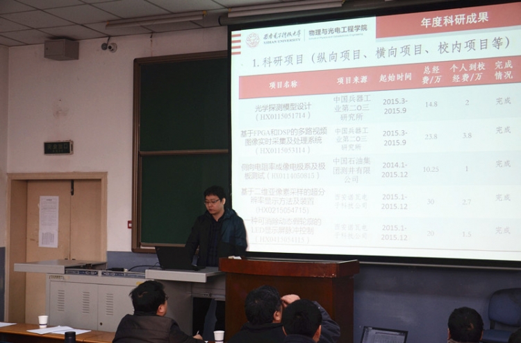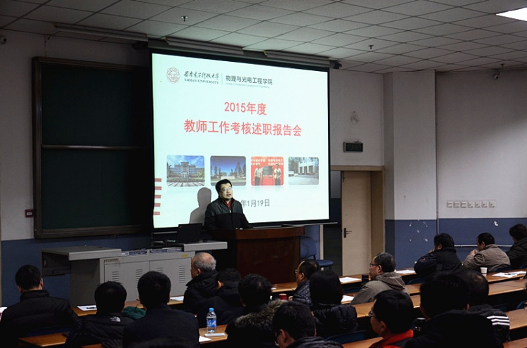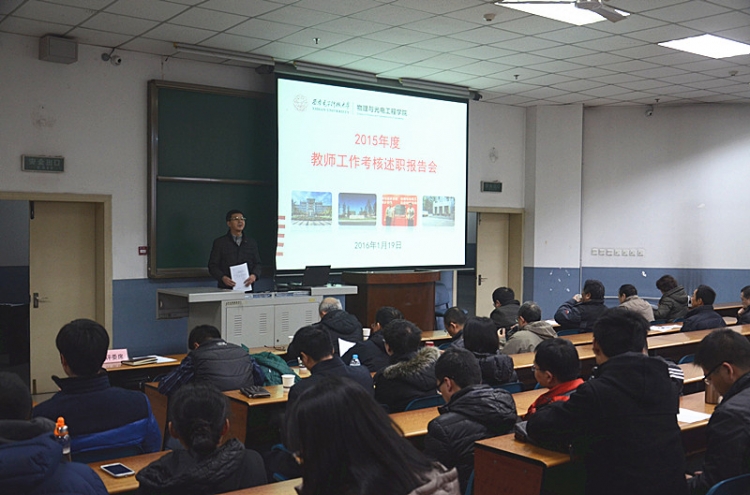 1月19日上午,物理与光电工程学院在北校区阶教505举办2015青年教师年度考核总结述职报告会,学院45周岁以下青年教师逐一上台,详细汇报个人一年来的工作情况。报告会由公司党委书记杨光暐主持。