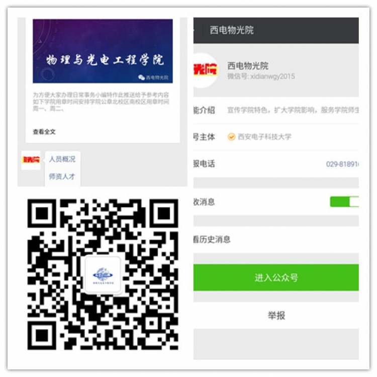 为加强学院新媒体平台建设,完善学院“两微一端”宣传、服务格局,学院于2015年9月开通官方微信平台微信号,并在此基础上组织成立学院自媒体工作室。学院官微以“展示物光风采、服务广大师生”为宗旨,致力于推送校园第一资讯,展现校园多彩生活,传播优质校园文化,弘扬团结、和谐、包容、进取的西电风尚。微信平台设有“学院概况”、“学院导航”及“员工园地”三大板块,还为广大师生开通了校园服务和生活助手等版块,使订阅者可以方便快捷地查阅到校内相关信息,获取学院各类相关资讯。