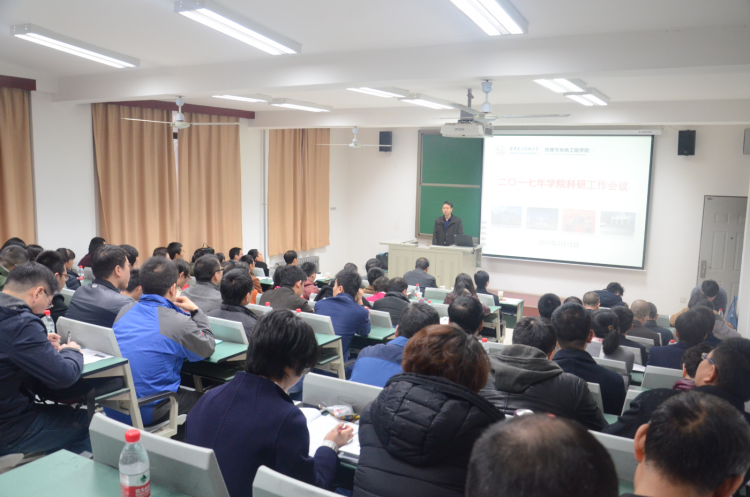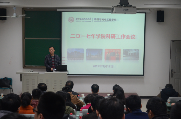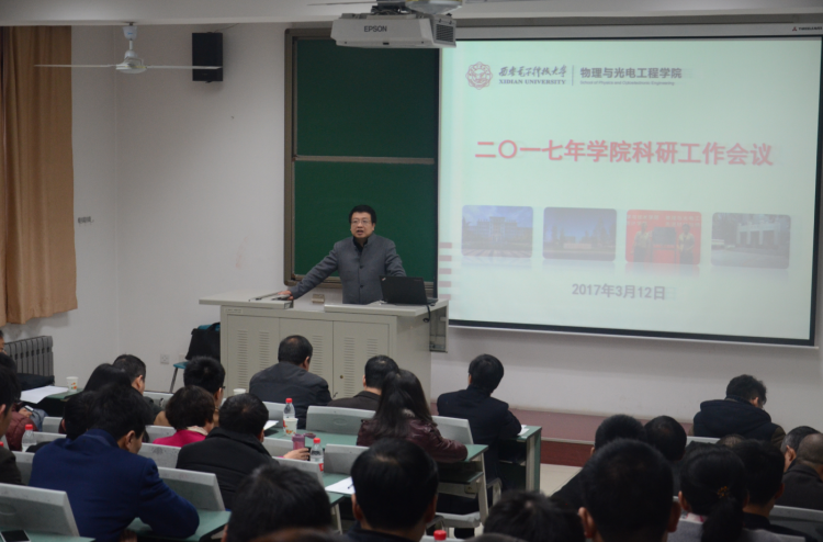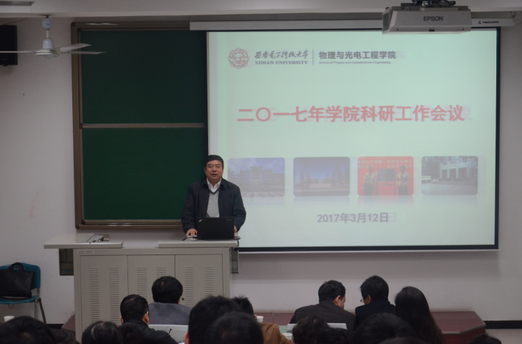 (通讯员:李维嘉)3月12日上午,物理与光电工程学院于北校区西大楼219教室召开2017年学院科研工作会议,旨在总结年度工作,凝练发展方向,交流心得体会,共同谋划学院科研工作的发展大局。副董事长杨银堂、科研院常务副经理石光明、副经理蔡固顺、经理助理刘珠梅等领导干部,物光院领导班子及全体教师参加了此次会议。会议由学院副经理邵晓鹏主持。