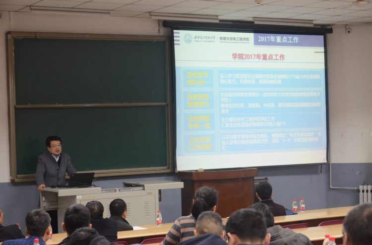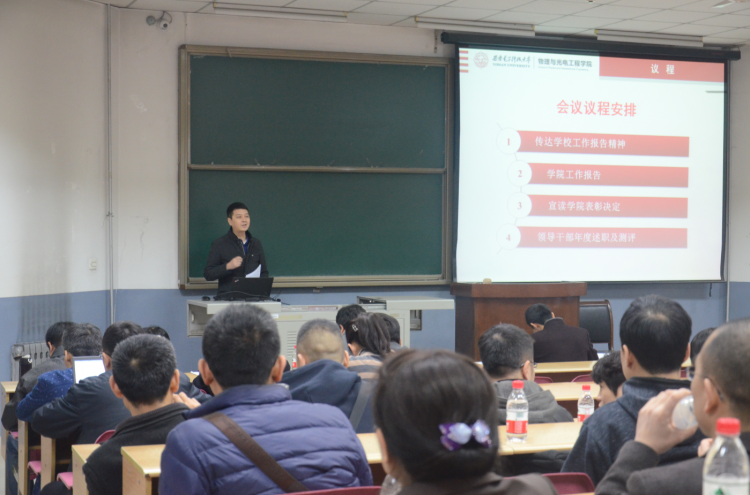 (通讯员:李维嘉)3月10日晚,物理与光电工程学院于北校区J-201教室召开2017年学院工作会议,传达学校工作会议精神,总结梳理上一年度学院各项工作,表彰学院2016年度先进集体和个人,安排部署学院2017年重点工作。学院领导班子、全体教职工参加了此次会议,会议由学院副党委书记林波主持。