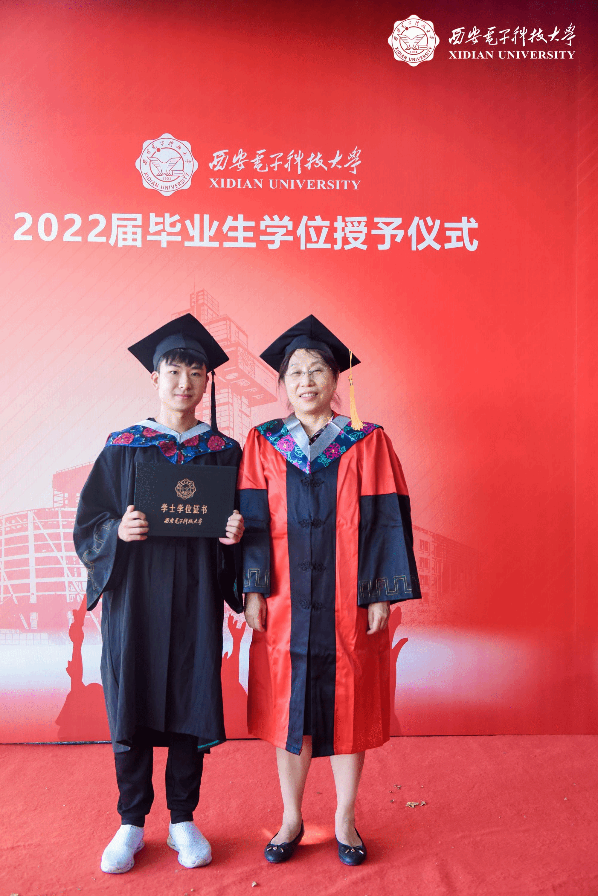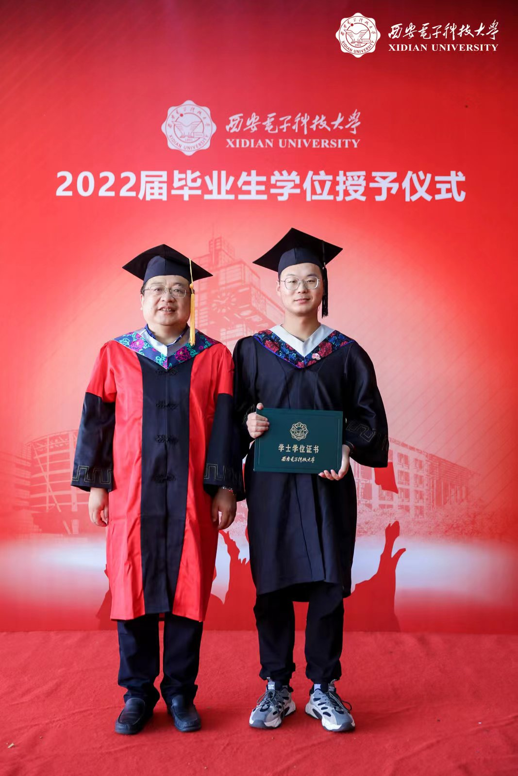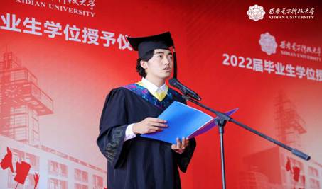 毕业生代表、学校优秀毕业生杨博同学发言,他代表学院全体2022届本科毕业生,向曾经教导、陪伴和帮助他们的师长、亲友们,以及在疫情期间为他们的学习生活提供保障的各界人士,表达最真诚的谢意。他表示:“这四年的老员工活,是我梦想开始的地方,如果说人生是一本书,那么老员工活便是书中最美丽的彩页;如果说人生是一台戏,那么老员工活便是戏中最精彩的一幕。这四年,不但使我提高专业素质、结交人生挚友、扩展眼界思维等等,更重要的是,我感受到了西电春的温馨,夏的炽热,秋的丰实,冬的烂漫。让我明白,只要心中有目标并为之努力,就一定能战胜所遇的困难与挫折。”