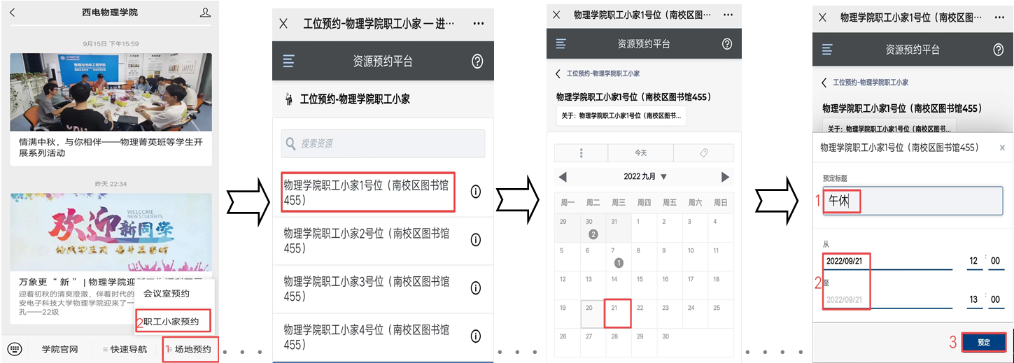 【预约方式】:微信公众号“西电yl23455永利集团”-场地预约-职工小家预约-选择工位、日期-预约提交-预约成功(注:每人每天仅限预约1次工位)。