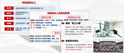 会议首先传达了学院关于学院组织机构、领导分工、机关人员岗位职责、学科方向、学术交流、国际招生、人才引进、合作办学、师德师风、疫情防控等方面的情况。接着还向与会老师介绍了学院近期发展动态,并强调学院在南校区建设的“职工小家”,该设施为有效解决了南校区无房教师上课缺少午休场所的困难,为高质量的备课提供了良好的服务。
