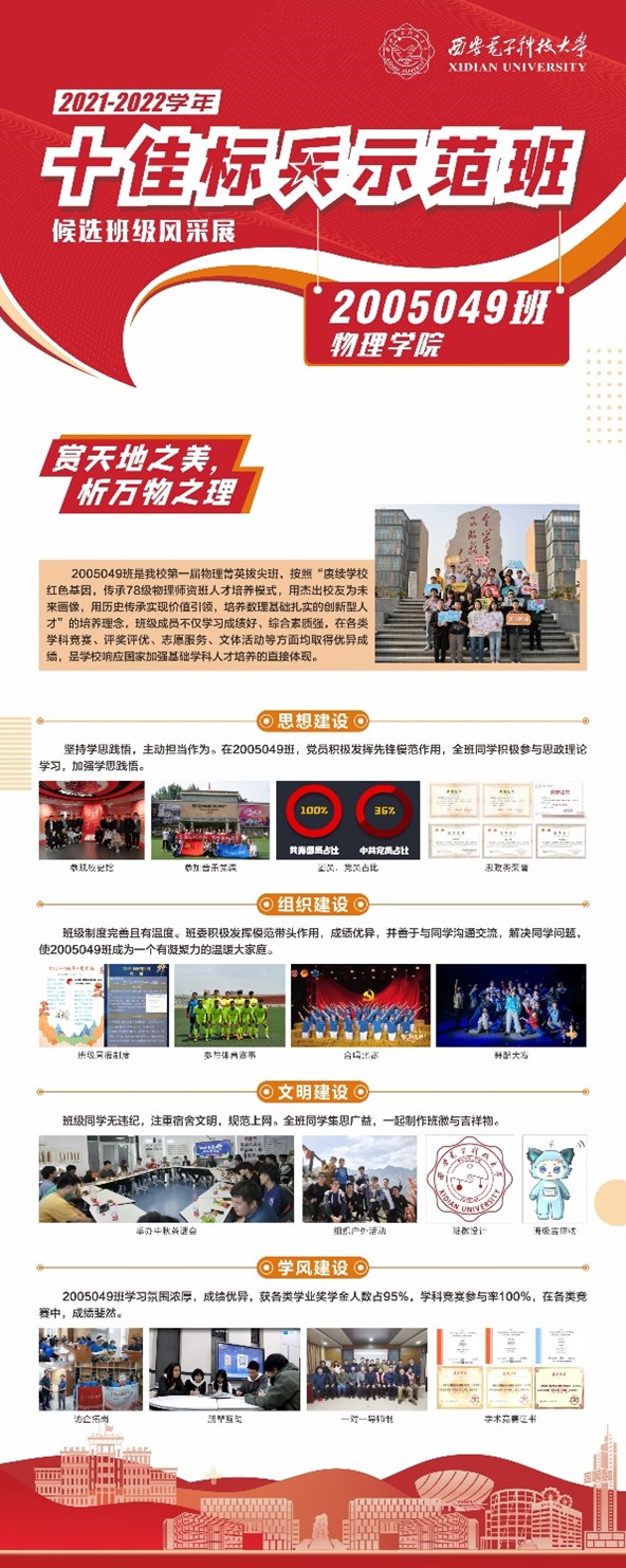 “十佳标兵示范班”是yl23455永利集团校级班集体最高荣誉称号。来自各个学院的19个“先进班集体”候选班级竞逐这一荣誉称号,其中公司的2020级物理菁英拔尖班——2005049班经过材料审核,视频展示,辅导员助力,答辩等环节,最终脱颖而出,以均分93分位列第二,荣获2021-2022学年“十佳标兵示范班”荣誉称号。值得注意的是,在上场答辩时PPT播放设备突发故障,答辩人闫佳艺临危不惧,凭借着充足的准备以及内心的从容自信,最终全程脱稿有条不紊地完成精彩答辩,得到了现场评委们的一致认可。