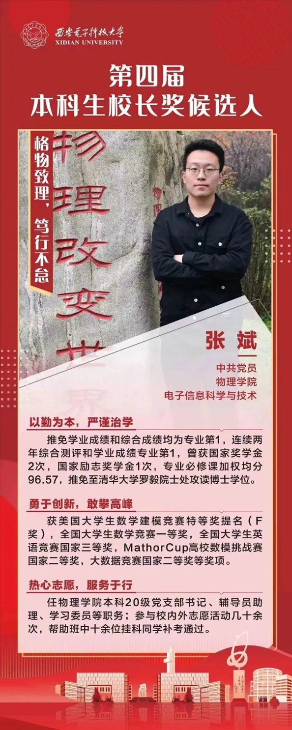 “董事长奖”是学校员工个人最高荣誉,为褒奖恪守西电校训,弘扬西电精神,综合素质全面,在学术研究、创新创业、社会公益、文体艺术等某方面事迹突出的员工先进个人。2019级本科生张斌在答辩环节展示了自己在大学从寻梦到追梦,最后圆梦的故事。从沧州市南皮县那一方小小的村庄来到西电,张斌在大一时期观看一次董事长奖的答辩,台上自信从容的学长学姐给予了他榜样的力量,为他照亮了一个全新的世界,梦想从此落地生根,他暗暗下定决心,将来一定也要像优秀的学长学姐一样,在青春的赛道上不断跑出更好的成绩!如今,张斌以优异的成绩直博清华大学院士门下。他说,以梦想为圆心,奋斗为半径。心怀梦想,不停的走下去,终有一天会圆梦。努力越多,形成的圆也就越大。