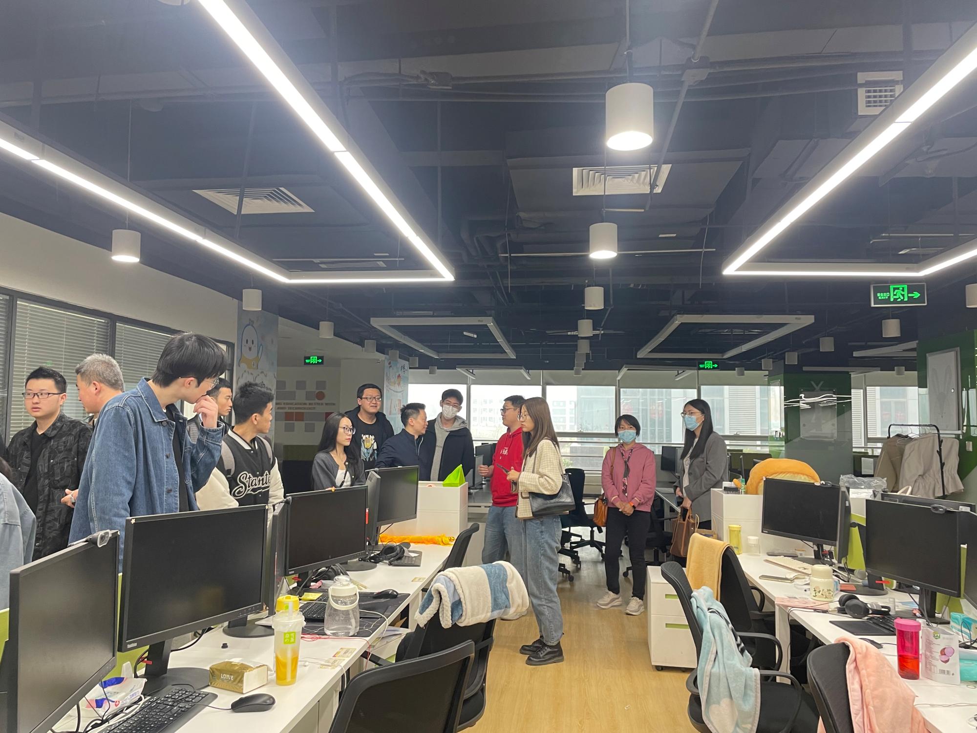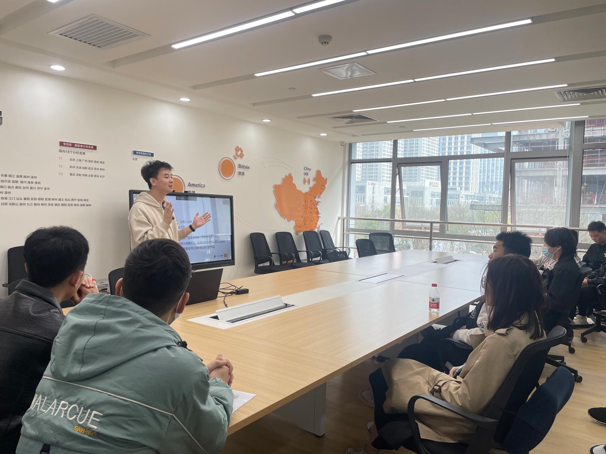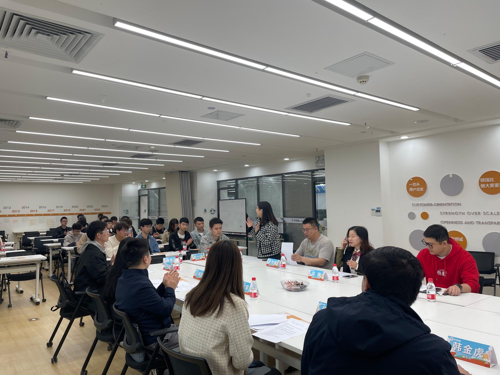 首先,在学而思校招主管张磊杰老师的带领下,师生共同参观了在线教学基地,感受企业的文化氛围,体验教培机构的工作特色。