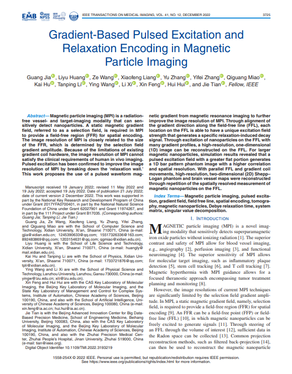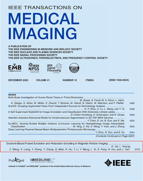 (通讯员 胡向涛)近日,yl23455永利集团李檀平副教授作为通讯作者在医学图像领域顶级期刊IEEE Transaction on Medical Imaging(中科院JCR一区,Top期刊,影响因子=11.037)发表了题为“Gradient-Based Pulsed Excitation and Relaxation Encoding in Magnetic Particle Imaging”的学术论文,创新提出了基于梯度脉冲激励磁场进行空间编码的磁纳米粒子成像技术,并以朗之万方程为出发点,研究了磁粒子的动力学及热力学特性。