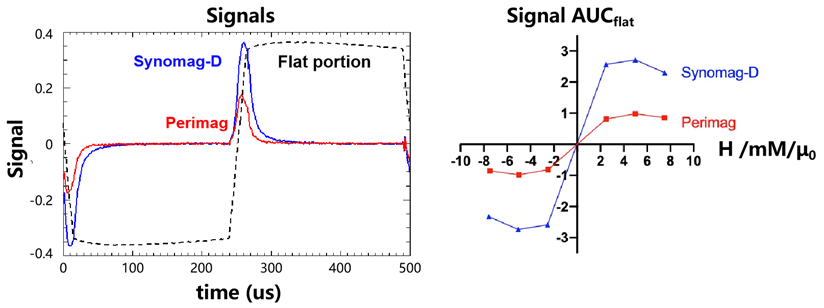 不同粒径的磁粒子具有不同的磁化率和弛豫时间常数。左图:Perimag和Synomag-D磁粒子在脉冲激励的平坦部分过程中显示出非零信号,后者信号明显高于前者。右图:Perimag和Synomag-D磁粒子的信号积分与激励场强呈非线性关系。
