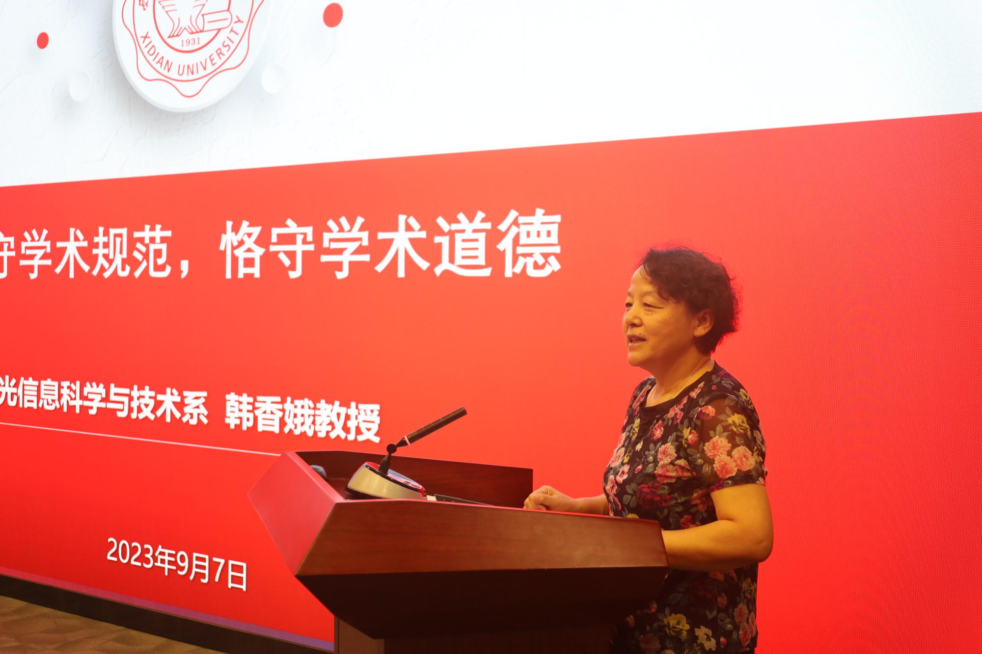 随后,魏兵向新生介绍了公司产品情况及要求,希望新生同学能够迅速完成角色转变,尽早适应研究生生活。导师代表韩香娥教授向同学们开展了学术道德及学风建设培训,她介绍了学术道德相关要求以及学校相关文件规定,并以西电物理学科创始人王一平教授、物理实验奠基人胡昌璧教授的先进事迹,展现在科学研究中一丝不苟、刻苦钻研的精神,希望同学们能够向老一辈科学家学习,传承科学家精神、潜心科学研究。