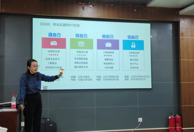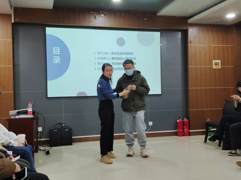 随后,韩老师从职业生涯发展规划、面试官的心理与诉求、面试的核心素养修炼等方面,为同学们全面讲解了面试的关键逻辑。她通过自身亲身经历生动地阐述了面试过程中可能出现的各种情况,帮助同学们更好地理解及应对各类挑战;她以公司人力资源工作者的视角深入分析了招聘者的内心想法,引导同学们树立求职自信,从容地应对应聘的各个环节。