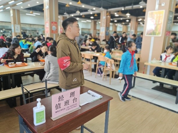 美好食光引导员每天在午餐高峰之前提前到达各餐厅,提醒就餐人员有序排队,并收集就餐人员对餐厅建设和菜品改进的意见,同时协助发放“一元餐”卡片,积极收集“一元餐”菜品建议,及时了解师生的需求。