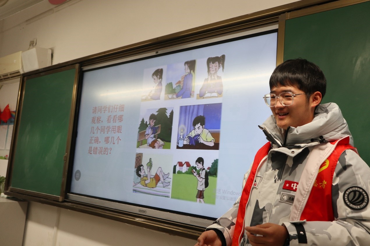 第二堂课,队员们围绕近期感冒流感问题宣讲健康基础知识,内容包括健康的定义、用眼健康、饮食健康、个人习惯、个人免疫等方面,并引导同学们平时加强体育锻炼,养成良好生活卫生习惯,树立健康保护意识。志愿者们用幽默风趣的讲解让同学们在轻松愉快的氛围中学到了更多关于健康的知识。