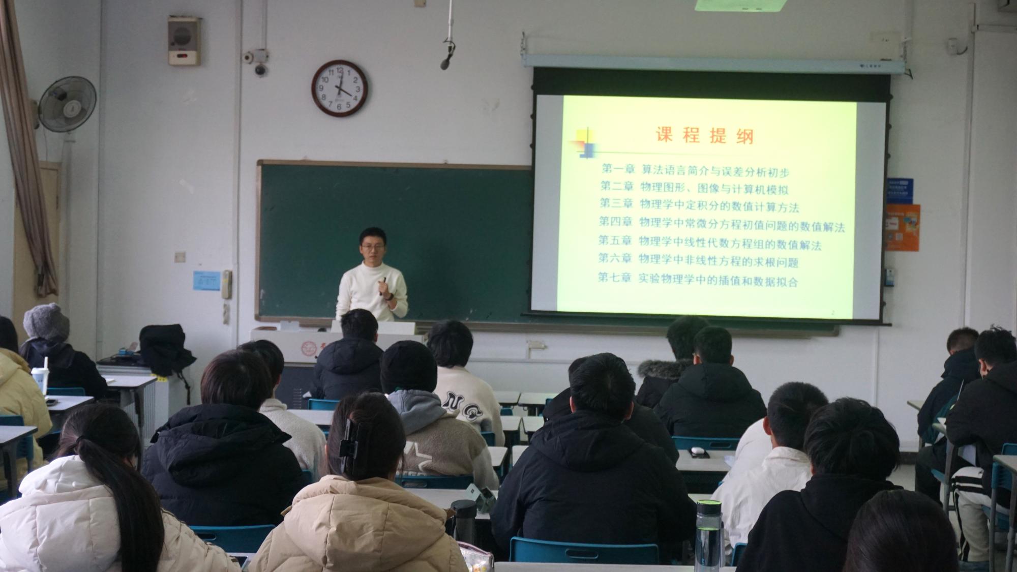 1月5日上午,崔志伟对《大学物理Ⅱ》课程进行了系统介绍,详细讲解静电场、高斯定理、静电场的环路定理、静电能、电介质、恒定电流的磁场、电磁感应与电磁场等课程内容,带领同学们全面梳理了课程框架和重点难点。随后,他利用经典例题进行讲解分析,让同学们进一步加深对知识点的理解。