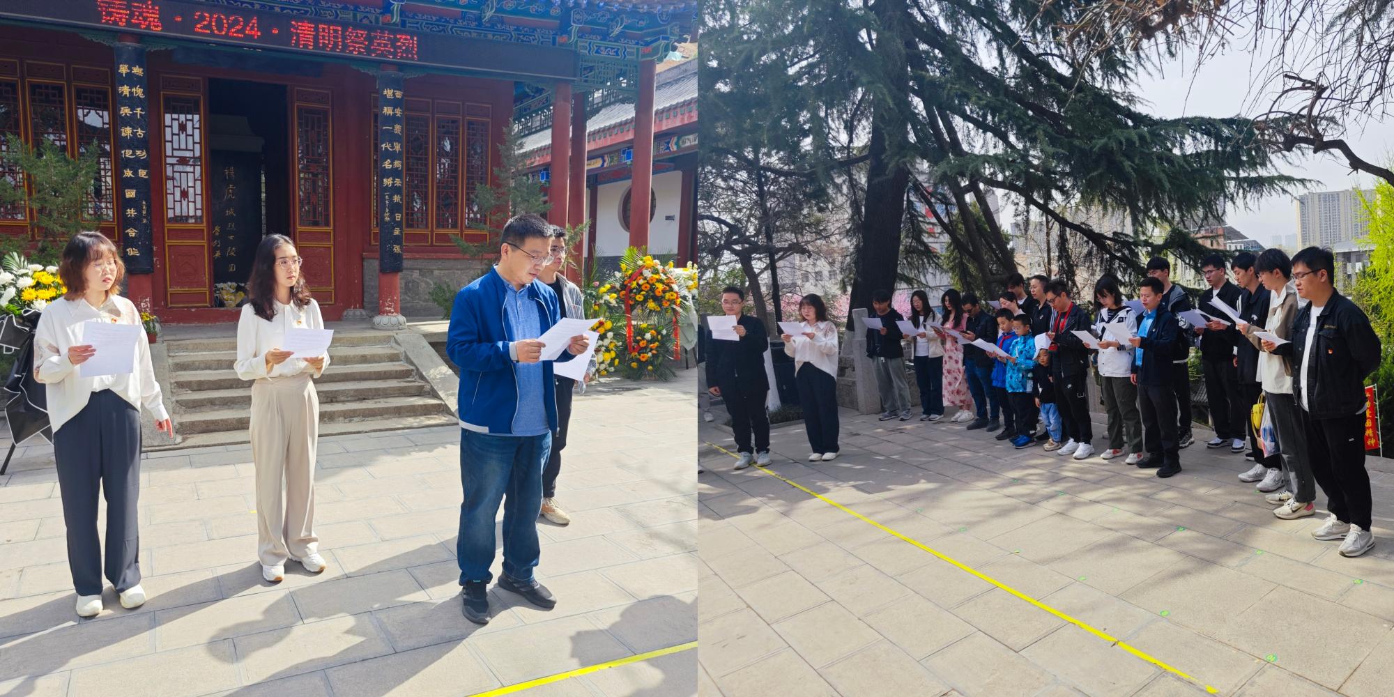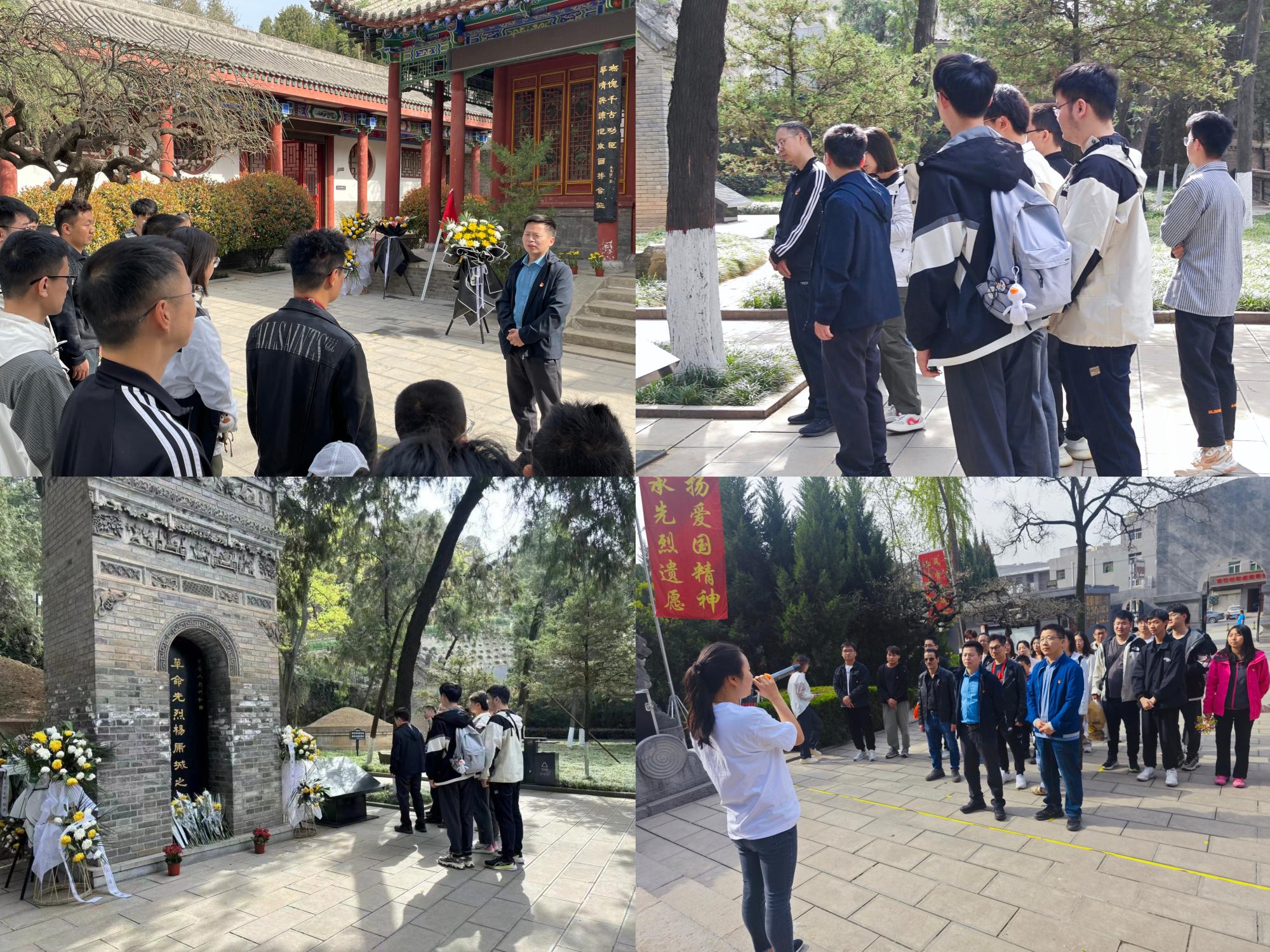 在陵园广场,大家聆听杨虎城将军生平,学习其丰功伟绩及革命历程,并在纪念碑亭献花。“红色电波”师生联合党支部书记李江挺领队朗诵原创诗歌,缅怀先烈。