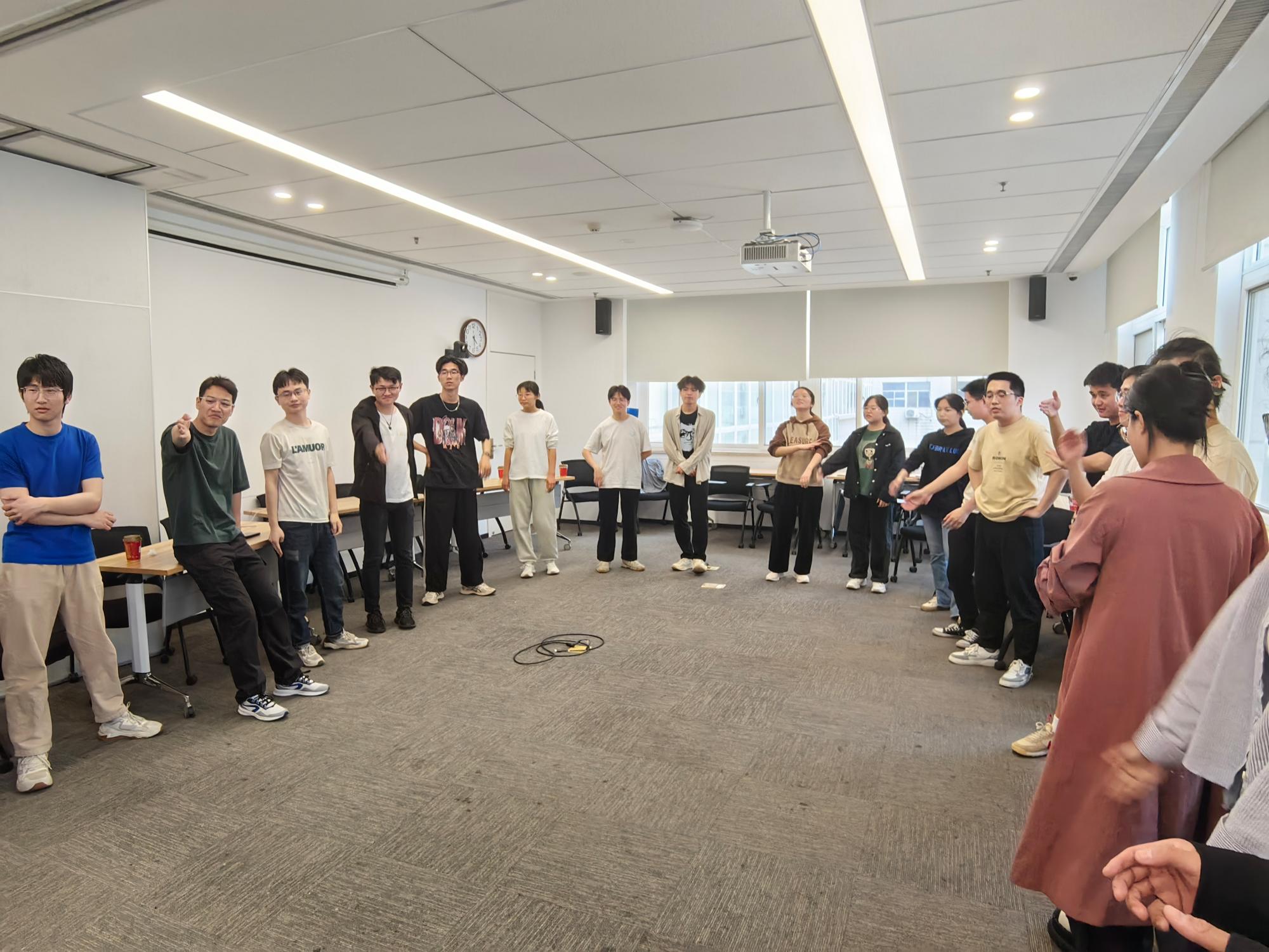在导师的带领下,首先进行的是以“松鼠搬家”为主题的热身游戏。同学们被分为三人一组,两个人面对面双手举起搭成一个“树屋”,中间蹲下一人,当做“树屋”里面的“松鼠”,随着主持人发出“松鼠搬家”“伐木工人”“森林大火”等指令,同学们需要根据指令变换位置。在热身游戏中,同学们逐渐适应了即兴喜剧的思考模式:没有预设、没有剧本,根据“启发词”快速反应,彼此信赖、互相配合,共同完成任务。