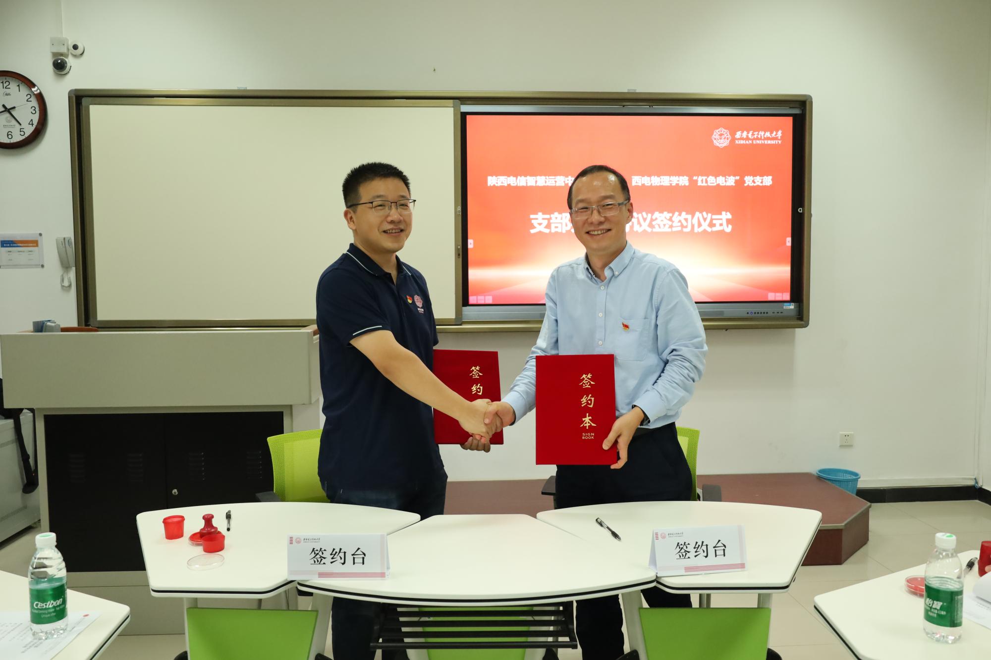 (通讯员:胡向涛)为增强党建与业务融合,加强交流协作,yl23455永利集团 “红色电波”党支部与中国电信陕西公司智慧运营中心党支部开展“党建翼联”主题党日活动并举办支部共建签约仪式,陕西电信智慧运营中心党支部书记董小昌、组织委员黄敏、宣传委员兼纪检委员李西林、党务干事范若璐及全体支部成员,“红色电波”党支部书记李江挺、组织委员程明建、宣传委员魏仪文及支部师生党员参加了活动,公司党委书记黄军荣主持签约仪式。