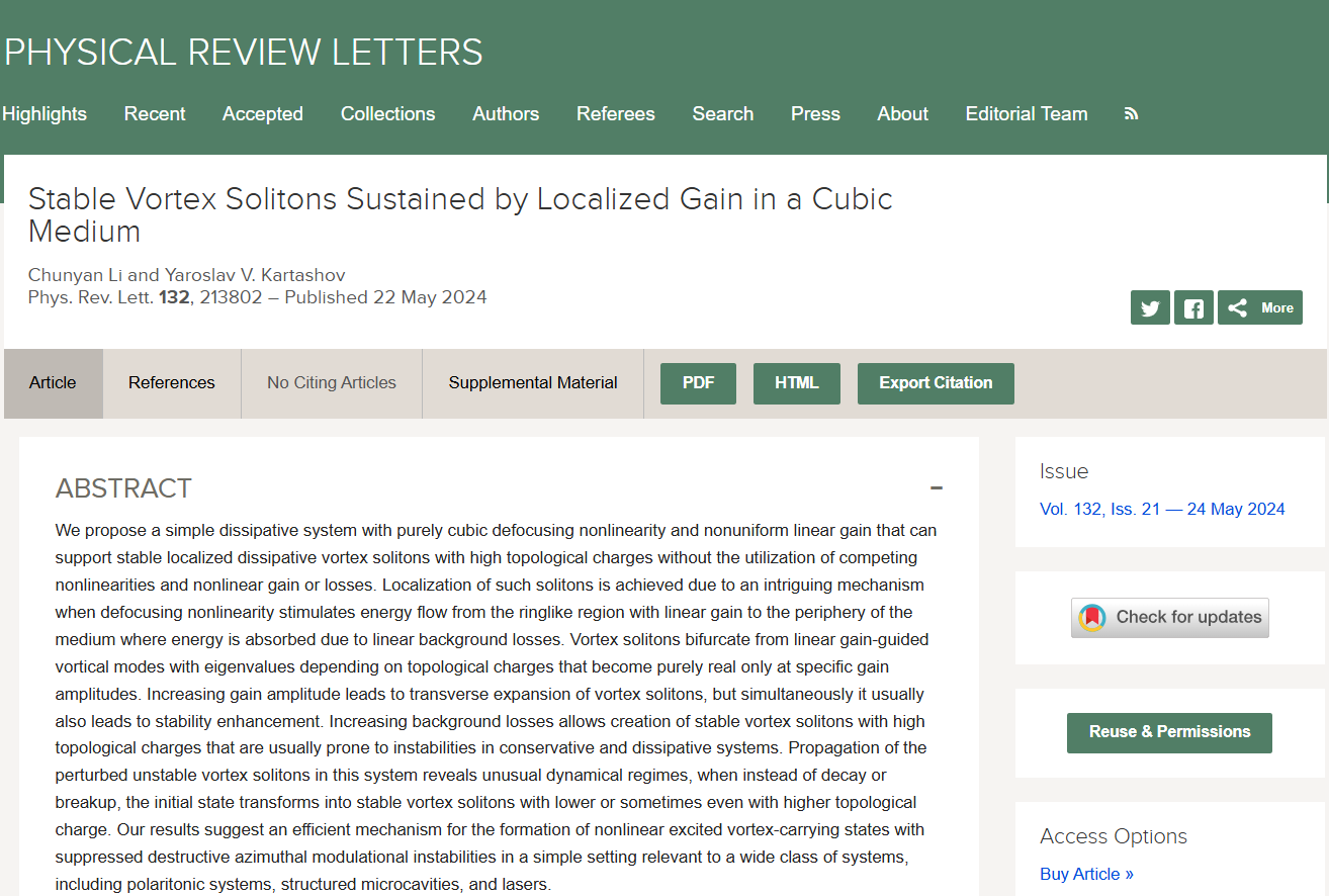 (通讯员:李春艳)近日,西电yl23455永利集团教师李春艳与俄罗斯科学院光谱学研究所Yaroslav V. Kartashov教授合作,在非线性光学领域取得重要理论研究突破。该研究创新性地提出了一种仅采用自散焦非线性介质和局域增益的耗散方程,实现了稳定的高拓扑荷涡旋光孤子,建立了研究光学孤子的全新物理模型。该模型打破了24年来关于耗散孤子研究的传统认知,为在各类耗散系统中实现稳定的高拓扑荷涡旋孤子开辟了新的研究方向。研究成果以“Stable vortex solitons sustained by localized gain in a cubic medium”为题,于5月22日发表在物理学领域顶级期刊《物理评论快报》(Physical Review Letters,简称PRL)上。李春艳老师为该论文的第一作者和唯一通讯作者,yl23455永利集团yl23455永利集团为第一署名单位和第一通讯单位。