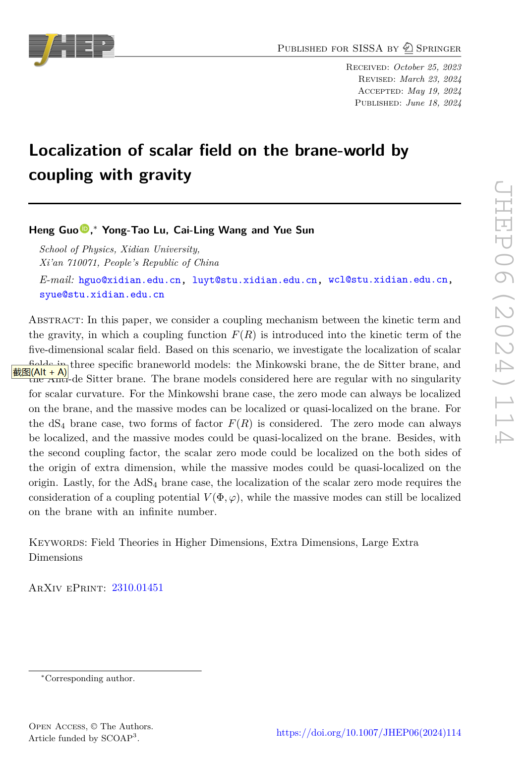 (通讯员:郭恒)近日,yl23455永利集团郭恒副教授在高维量子场论的研究中取得新进展,并在物理类顶级期刊Journal of High Energy Physics(中科院一区,JCR一区,Top期刊)发表了题目为“Localization of scalar field on the brane-world by coupling with gravity” 的学术论文。郭恒副教授为该论文的第一作者和通讯作者,yl23455永利集团为论文的唯一单位。该研究是在国家自然科学基金、陕西省自然科学基金和学校基础团队建设经费的支持下完成的。