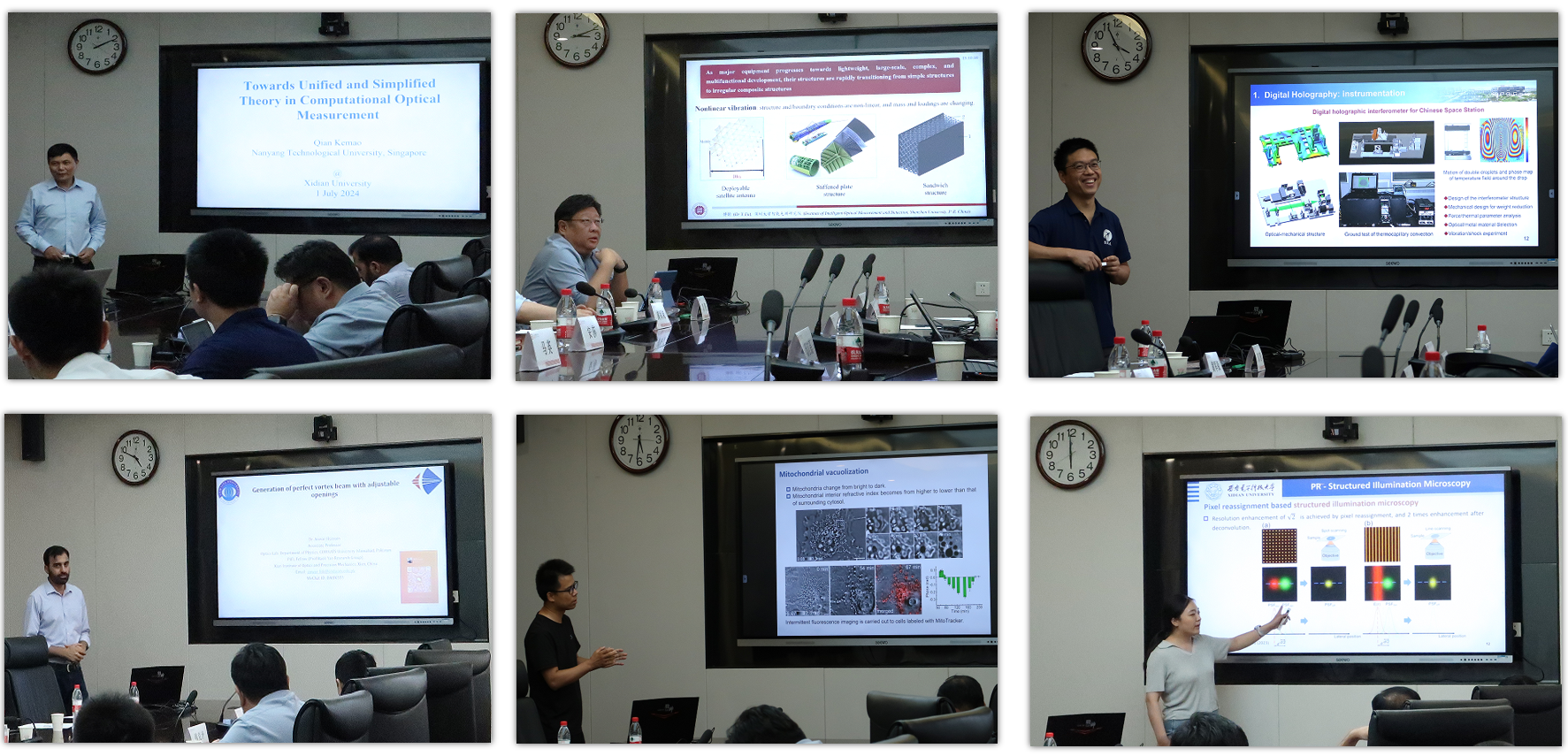 新加坡南洋理工大学钱克矛教授、深圳大学傅愉教授、广东工业大学邸江磊教授、巴基斯坦伊斯兰大学Anwar Hussain教授、西电yl23455永利集团马英和安莎老师分别做了学术报告并与参会师生进行交流研讨。钱克矛教授从光学测量出发,介绍了计算光学精密测量领域的基本方法和研究重点,以及在力学、材料等多个领域的应用。傅愉教授介绍一种新的非接触式振动测量方法:即激光与图像相融合的测振技术及其在结构稳态、非稳态振动测量,和在缺陷检测上的应用。邸江磊教授介绍了计算光学成像的发展背景以及“深度学习”在计算光学成像中的应用。随后,就“深度神经网络”所面临的挑战展开讨论,展望人工智能在计算光学成像中的巨大前景。Anwar Hussain教授介绍了涡旋光束的设计、产生以及在三维成像与测量中的应用。马英老师报告中介绍平场定量相衬显微技术,以及其在细胞器之间的时空动态和相互作用研究中的应用。安莎老师介绍了面向深层组织超分辨三维成像的结构光照明显微技术。此外,与会专家和研究生们分享了科研心得、写作经验,以及艺术感悟,希望与会研究生们能够提升科研能力、磨练写作技巧。