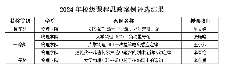 (通讯员:柴亚茹)近日,集团发布了《yl23455永利集团关于2024年优秀课程思政教学案例评选结果通知》(本字〔2024〕114号),公布了2024年度校级优秀课程思政教学案例评选结果。经个人申报、学院推荐、学校评审,全校共评选出特等奖9项、一等奖14项、二等奖23项。其中,公司赵文娟老师的《卡诺循环:热力学之魂,能效思辨之旅》荣获特等奖,张艳艳老师的《大学物理 R(I)--角动量守恒》、王小芳老师的《大学物理(Ⅱ)--法拉第电磁感应定律》、李春艳老师的《达瓦孜--非遗传承技艺中蕴含的刚体定轴转动定律》荣获一等奖,李金星老师的《大学物理(Ⅱ)--带电粒子在磁场中的运动》荣获二等奖,充分展示了公司在推进课程思政建设方面取得的积极成果和显著成效。