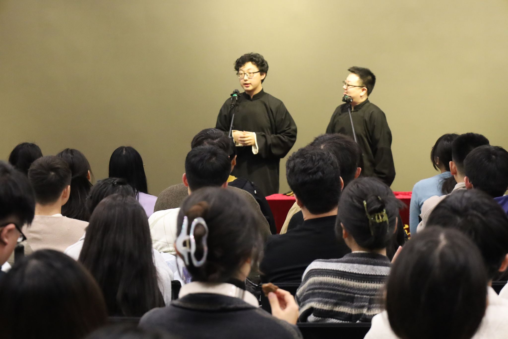 (通讯员 于天玮)把烦恼团成线团,用欢乐重新编织,如约而至的笑声驱散了不期而遇的秋思。10月26日,yl23455永利集团于北校区会议中心104成功举办“物忧物虑”喜剧专场演出。公司特邀yl23455永利集团介四相声社、西安交通大学博雅曲艺社、西安马上喜剧,为北校区师生带来了一个难忘的欢乐夜晚。演出现场起满座满、掌声笑声不断,共吸引250余名研究生师生前来观看。