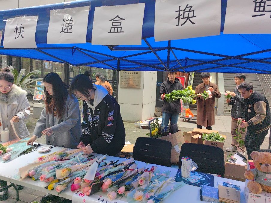 本次活动主题是用快递纸箱兑换鲜花,在初冬的清冷里,鲜花含苞待蕊,包裹着春天的绚烂,装饰了熟悉的街景。同学们纷纷清理宿舍,拿出购物未及时清理的快递盒换取鲜花,或是赠予好友、或是赠予爱人、或是装饰宿舍工位——抛下堆积的坏心情,与他人共赴一场开满鲜花的约定。