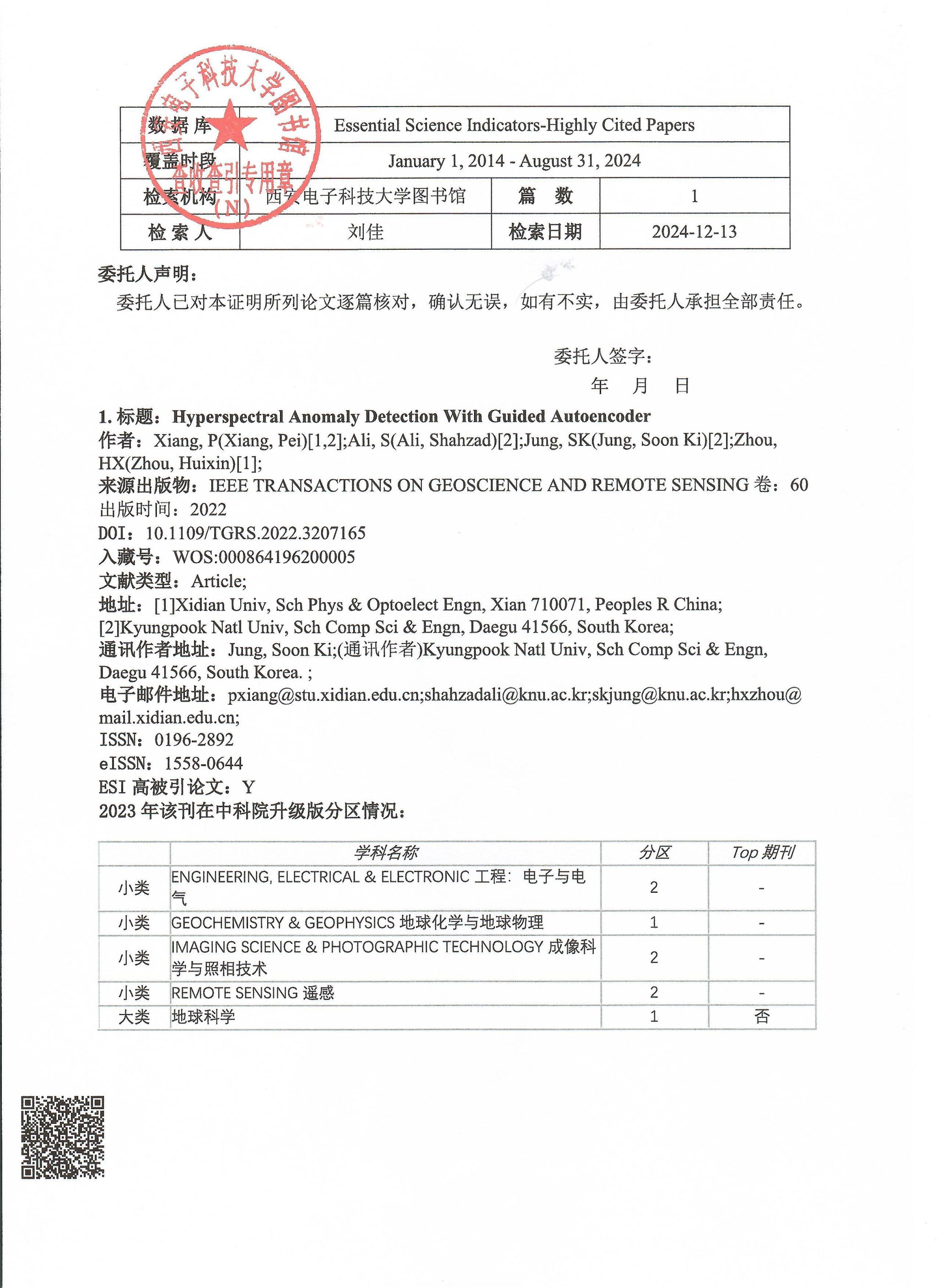(通讯员:向培)据2024年12月Essential Science Indicators(简称ESI)统计数据显示,yl23455永利集团周慧鑫教授团队成员向培以第一作者身份于2022年9月在《IEEE Transactions on Geoscience and Remote Sensing》(中科院一区、IF:7.5)上发表的研究成果“Hyperspectral anomaly detection with guided autoencoder”被ESI数据库遴选为高被引论文。