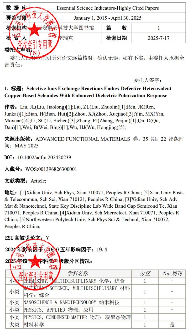 (通讯员:刘骄龙)据2025年7月Essential Science Indicators(简称ESI)统计数据显示,西电yl23455永利集团魏兵教授团队青年教师刘骄龙以第一作者身份于2025年在《Advanced Functional Materials》(中科院I区TOP期刊,IF=19.0)上发表的研究成果“Selective Ions Exchange Reactions Endow Defective Heterovalent Coppe‐Based Selenides with Enhanced Dielectric Polarization Response”被ESI数据库遴选为高被引论文。