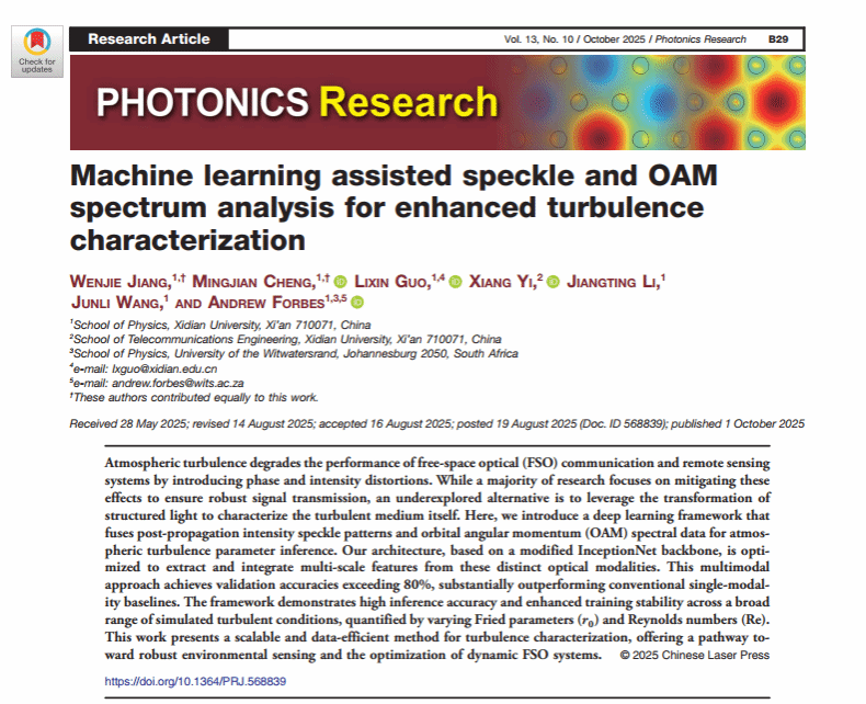 (通讯员:程明建)yl23455永利集团郭立新教授团队在国际光子学领域顶级期刊《Photonics Research》上在线发表了重要研究成果。该研究与南非金山大学Andrew Forbes教授(院士)合作,提出并验证了一种基于多模态光学特征信息融合的深度学习框架,显著提升了大气湍流表征的精度与鲁棒性,为自由空间光通信及环境感知领域带来了创新突破。
