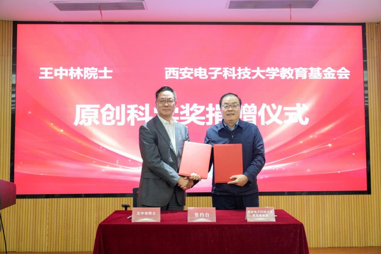 王中林与刘宏伟共同完成“中林班”签约仪式和“王中林原创科学奖”捐赠仪式。为支持母校一流建设、鼓励西电师生开展原始性研究,王中林院士将2023年获得的全球能源奖的奖金全部捐赠给母校。
