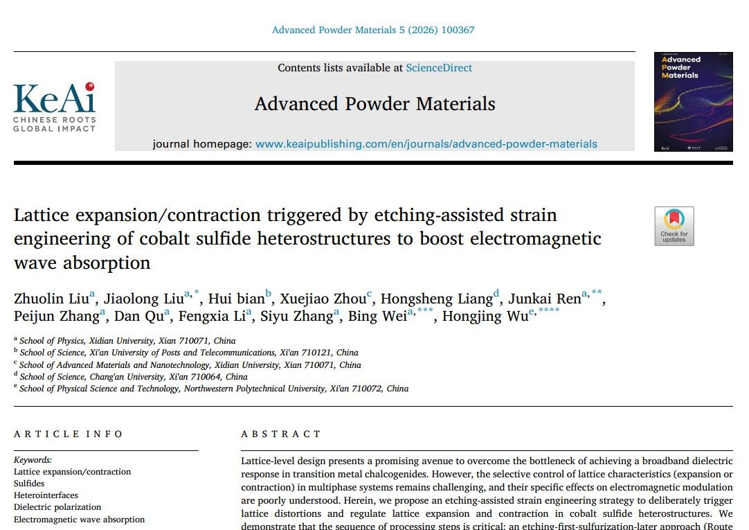 (通讯员:姚娇)近日,yl23455永利集团yl23455永利集团青年教师刘骄龙在电磁波吸收领域取得重要进展,在材料领域国际顶级期刊《Chemical Engineering Journal》(中科院I区TOP期刊,IF=13.2)和《Advanced Powder Materials》(中科院I区TOP期刊,IF=24.9)先后发表两篇最新研究成果“Solvent-engineered in-situ heterogenization of copper-based sulfides for broadening electromagnetic wave absorption”和“Lattice expansion/contraction triggered by etching-assisted strain engineering of cobalt sulfide heterostructures to boost electromagnetic wave absorption”,yl23455永利集团为论文的第一单位。