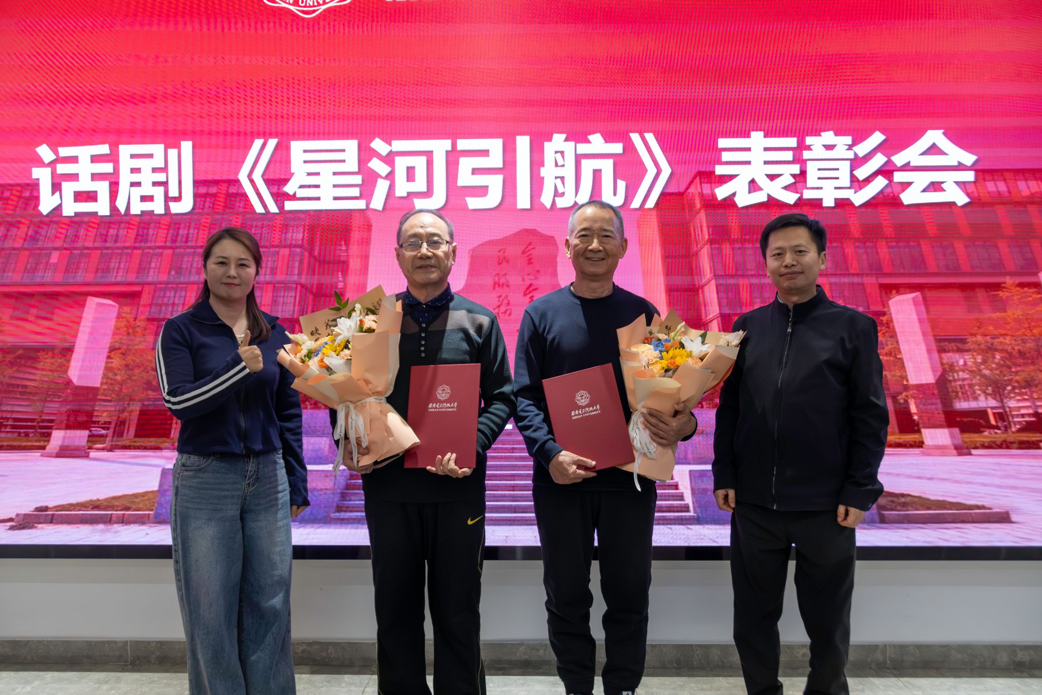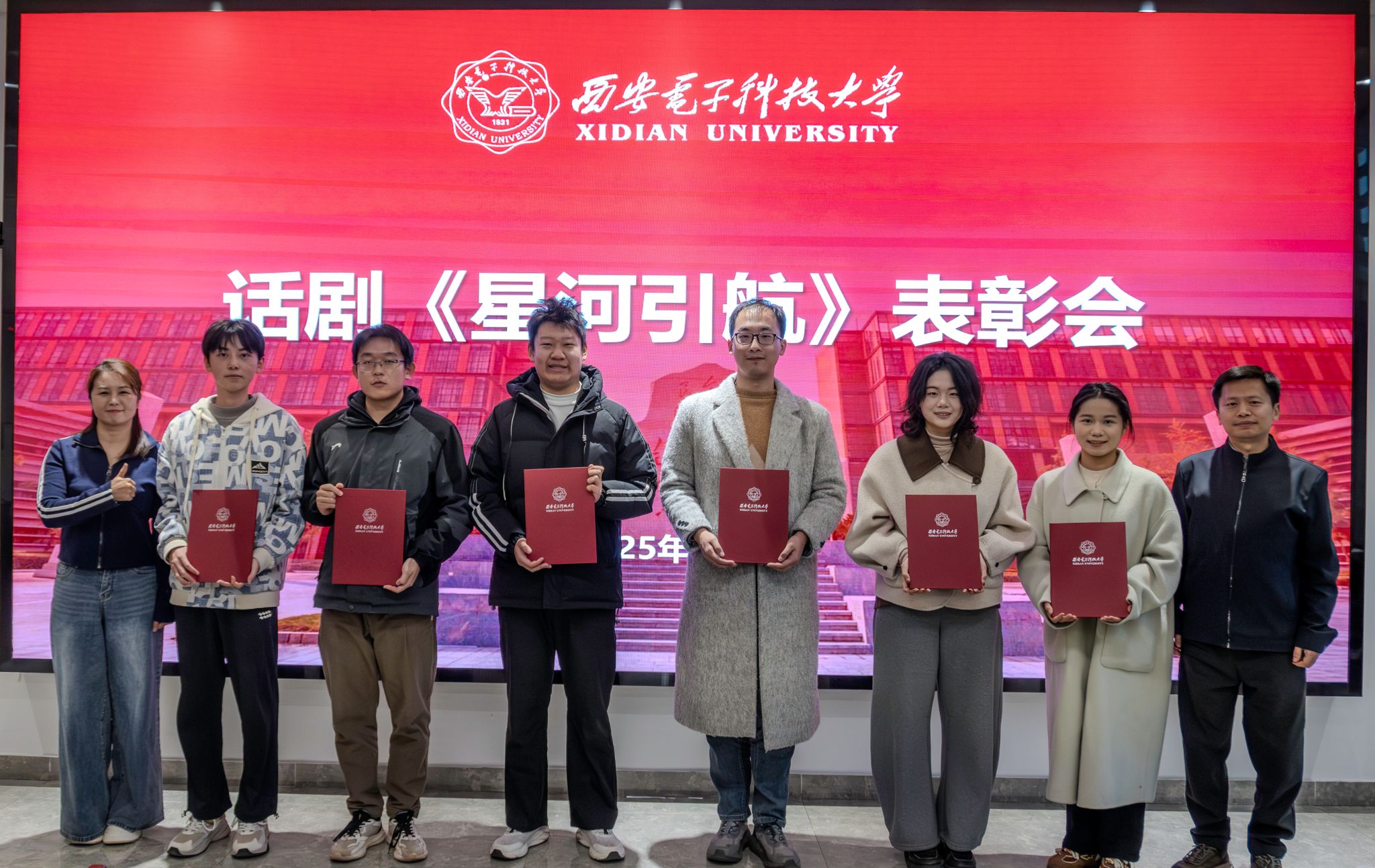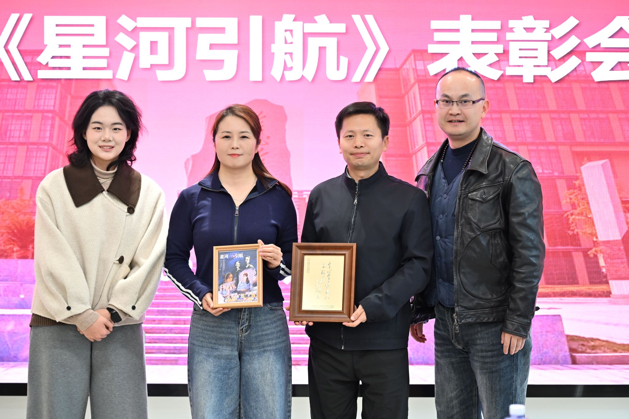 黄军荣为全体演职人员颁发表彰证书,并作总结讲话。他表示文字难以表示自己受到的感动,感谢全体演职人员的拼搏奉献,也对大家收获的成长十分欣慰。这其中既有个人的成长,也有集体凝聚力的展现。他回顾了2023年起专项工作组成立以来所做的工作,讲述了探寻历史背后的艰辛。黄军荣肯定了《星河引航》所取得的艺术成就和育人成效,说这是一场有温度、有青春的艺术盛会,有着别样的意义。他勉励大家接续传承剧中表达的科学家、教育家精神,真正做到惜时如金、甘为人梯、淡泊名利。他鼓励全体师生继续深化专项成果运用,常态化开展教育活动,构建“大思政”育人格局,为培养担当民族复兴大任的时代新人贡献西电物理力量。
