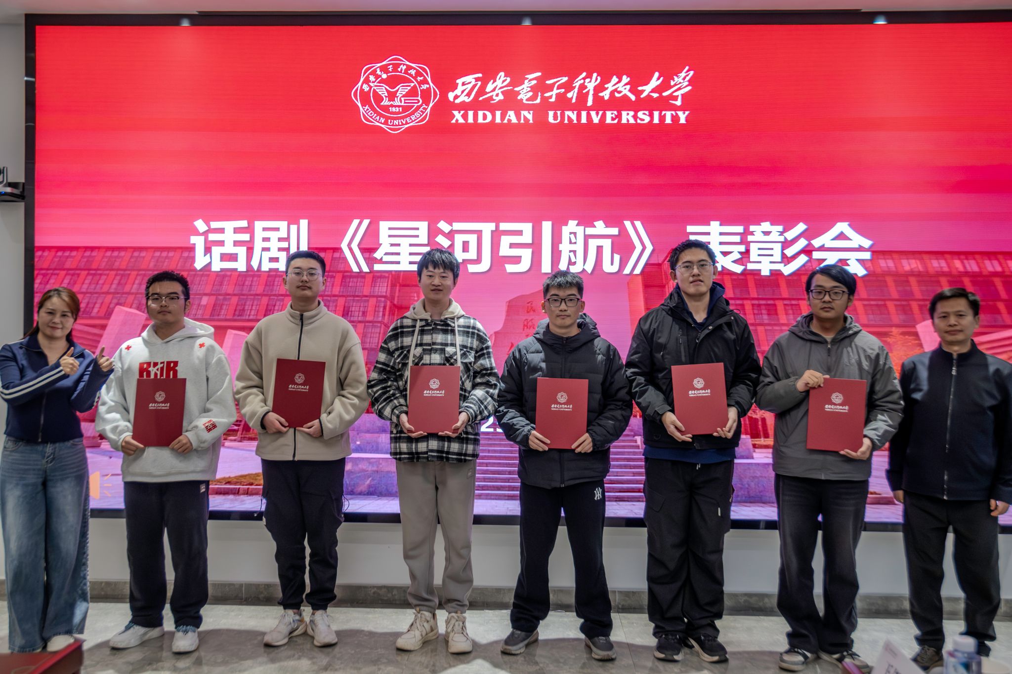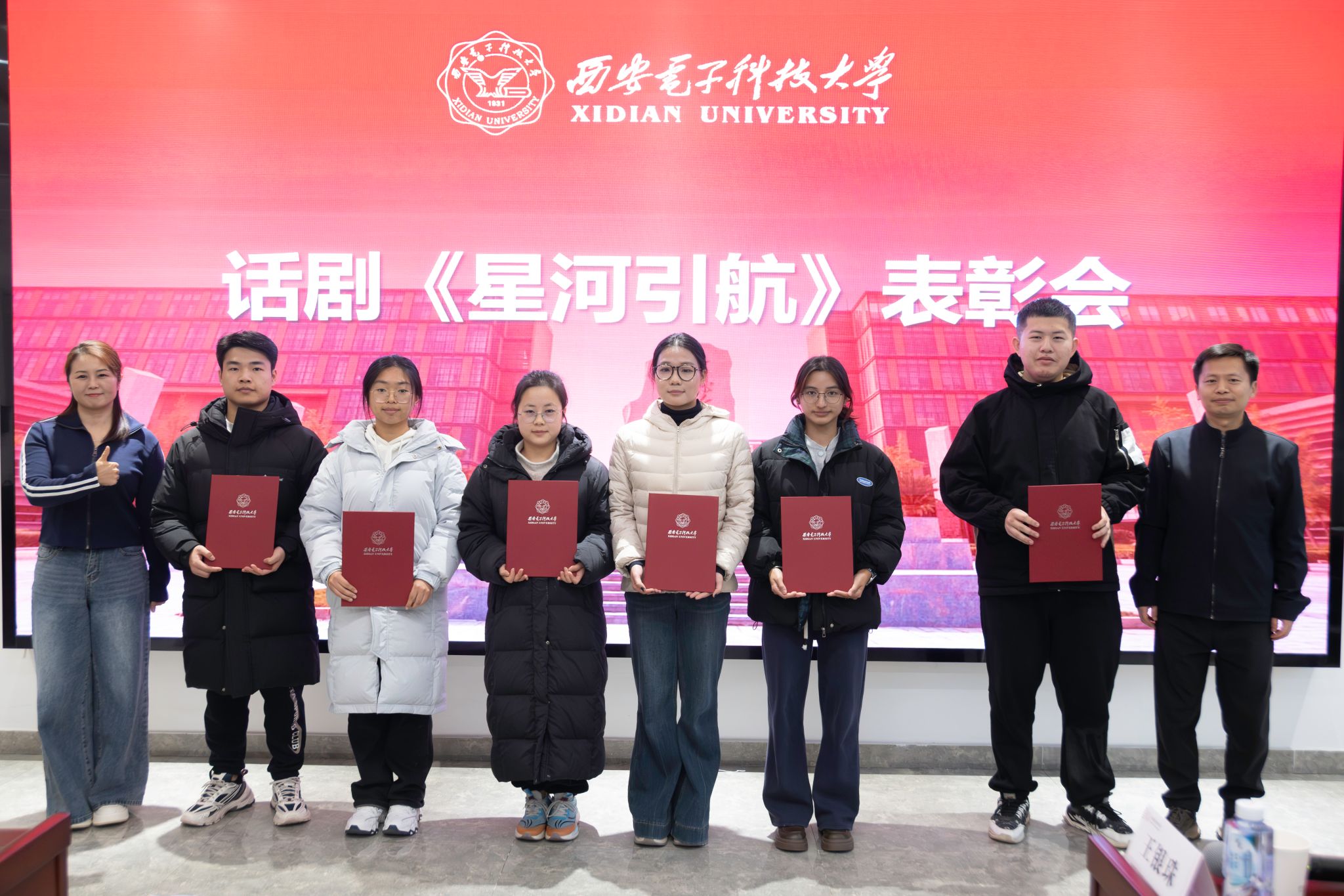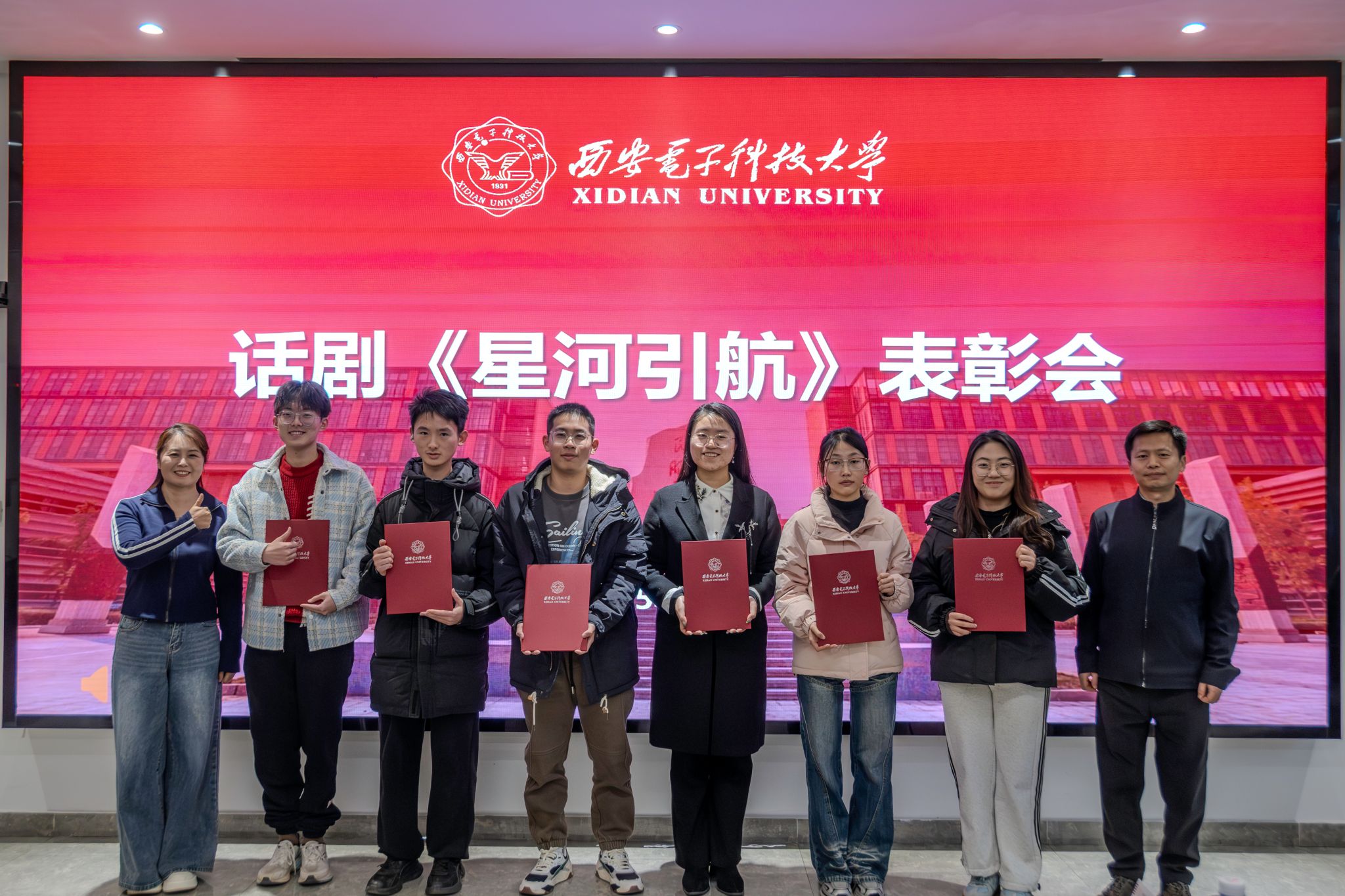 黄军荣为全体演职人员颁发表彰证书,并作总结讲话。他表示文字难以表示自己受到的感动,感谢全体演职人员的拼搏奉献,也对大家收获的成长十分欣慰。这其中既有个人的成长,也有集体凝聚力的展现。他回顾了2023年起专项工作组成立以来所做的工作,讲述了探寻历史背后的艰辛。黄军荣肯定了《星河引航》所取得的艺术成就和育人成效,说这是一场有温度、有青春的艺术盛会,有着别样的意义。他勉励大家接续传承剧中表达的科学家、教育家精神,真正做到惜时如金、甘为人梯、淡泊名利。他鼓励全体师生继续深化专项成果运用,常态化开展教育活动,构建“大思政”育人格局,为培养担当民族复兴大任的时代新人贡献西电物理力量。