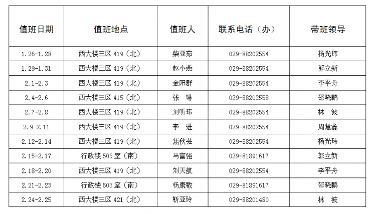 依据学校2016年寒假期间相关工作安排,学院寒假期间值班情况及相关安排如下:
