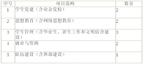 各学院在员工工作实践中形成的好经验、好做法。分员工党建、思想教育、员工管理、就业与资助、队伍建设等,项目分配表如下: