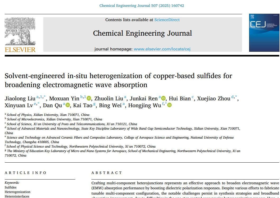 (通讯员:姚娇)近日,yl23455永利集团青年教师刘骄龙在电磁波吸收领域取得重要进展,在材料领域国际顶级期刊《Chemical Engineering Journal》(中科院I区TOP期刊,IF=13.2)和《Advanced Powder Materials》(中科院I区TOP期刊,IF=24.9)先后发表两篇最新研究成果“Solvent-engineered in-situ heterogenization of copper-based sulfides for broadening electromagnetic wave absorption”和“Lattice expansion/contraction ...